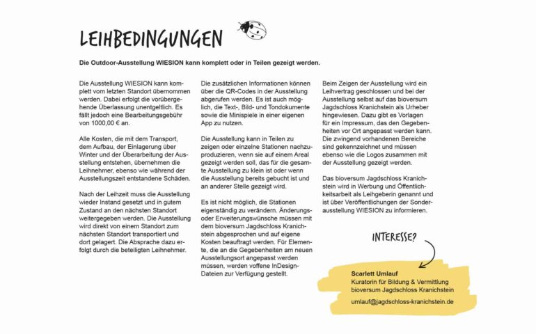 Auf dieser Seite können die Broschüre mit allen Infos und Bestandteilen der Ausstellung sowie eine Anleitung für die Nutzung des zur Verfügung gestellten Materials herunter geladen werden. Bei Interesse, die WIESION zu zeigen oder sie komplett oder in Teilen zu nutzen, schreiben Sie gerne eine e-Mail an Scarlett Umlauf, die Kuratorin der Ausstellung: umlauf@jagdschloss-kranichstein.de. Von ihr bekommen Sie dann den Link zum internen Bereich für den Download der Dateien. Bei Übernahme der Ausstellung muss ein Leihvertrag mit der Stiftung Hessischer Jägerhof, dem Träger des bioversum Jagdschloss Kranichstein abgeschlossen werden.
