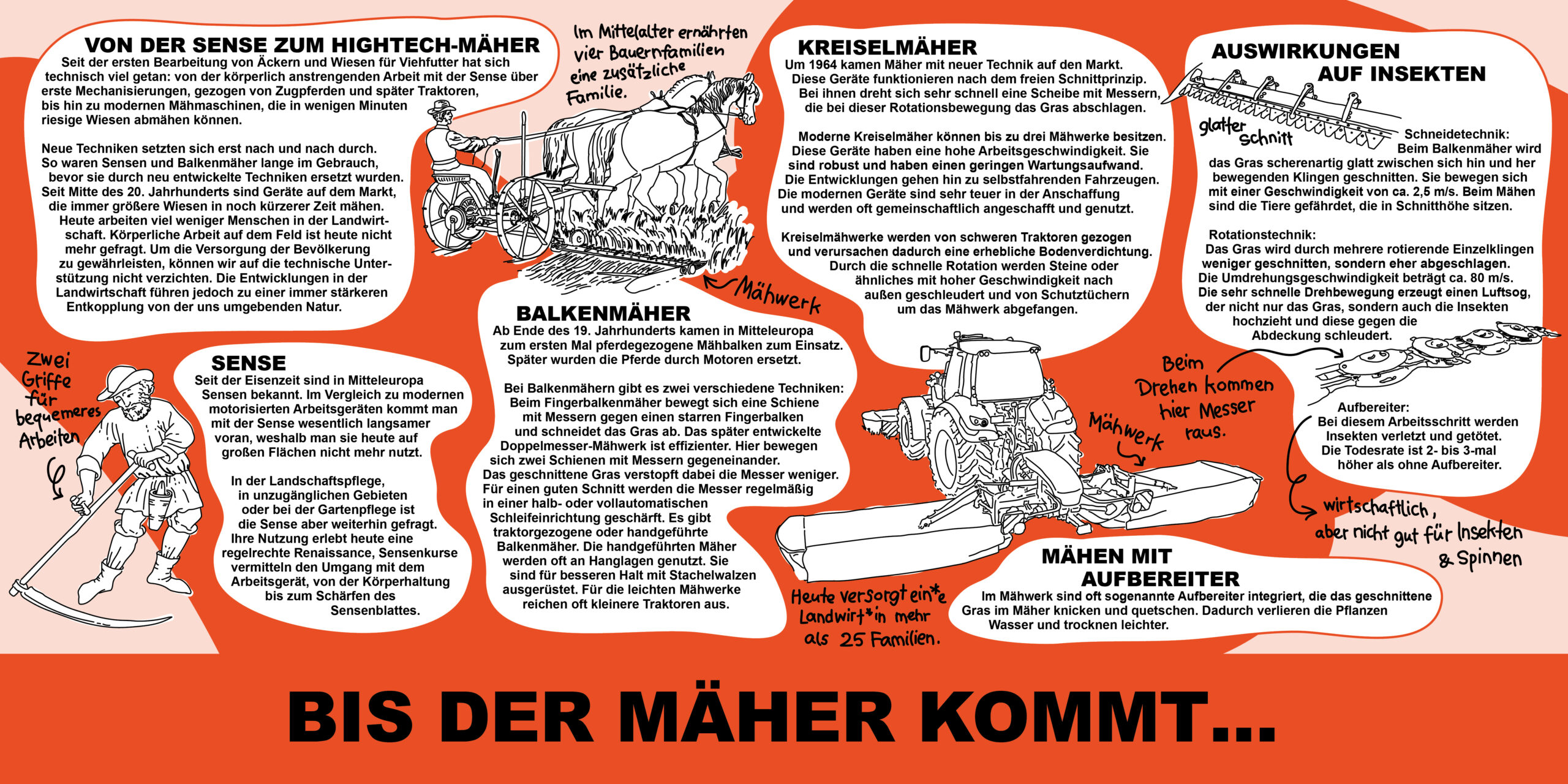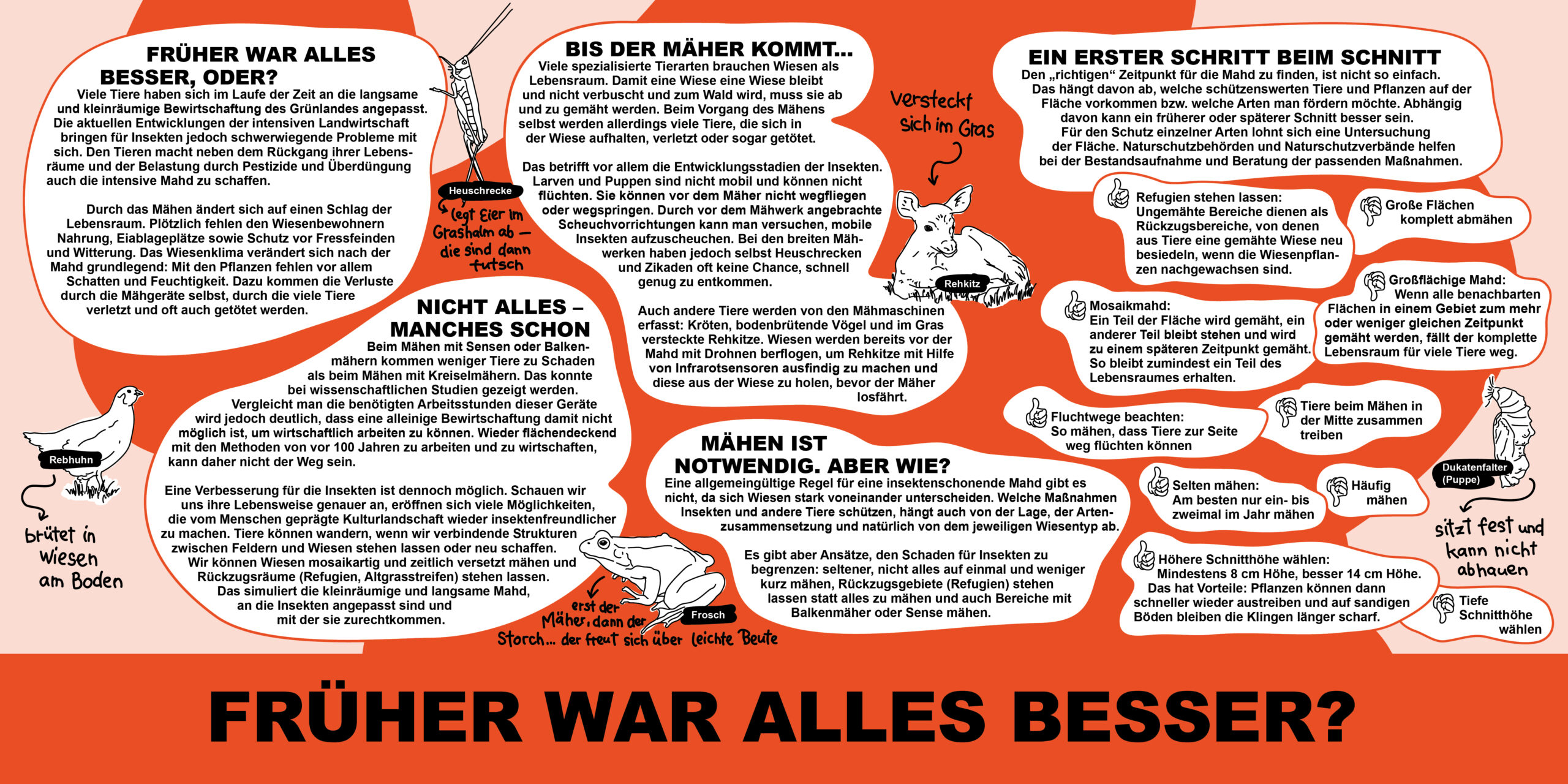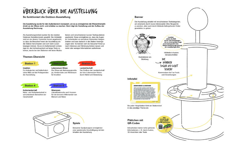 So war es möglich, nicht nur die biologischen Aspekte des Insektensterbens und der Mahd als einer der treibenden Faktoren zu betrachten, sondern auch die Relevanz dieses Themas auf verschiedene gesellschaftliche Bereiche. Dieser umfassende Blick spiegelt sich auch in der Ausstellung WIESION wider. Wie auch bei den anderen Projekten der FEdA (Forschungsinitative zum Erhalt der Artenvielfalt) stand hier die direkte Einbeziehung von Praxispartnern im Fokus, die mit ihren praktischen Fragestellungen und ihrer Expertise zur Praxistauglichkeit der Forschung beigetragen haben und ihrerseits die Thematik und die Forschungsergebnisse einer breiten Öffentlichkeit zugänglich machten.