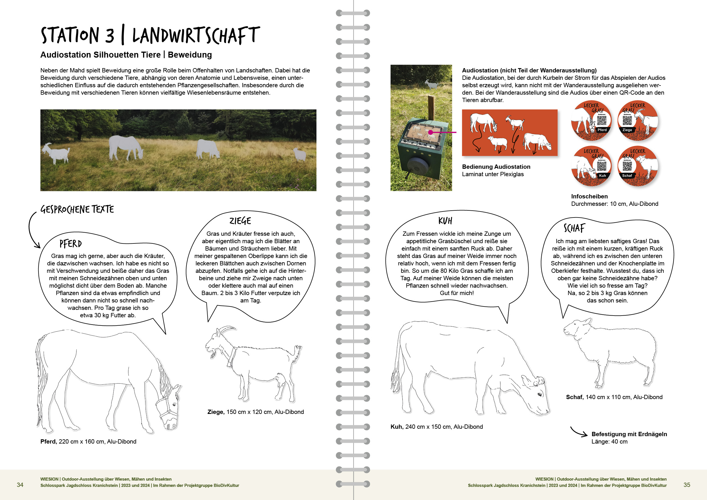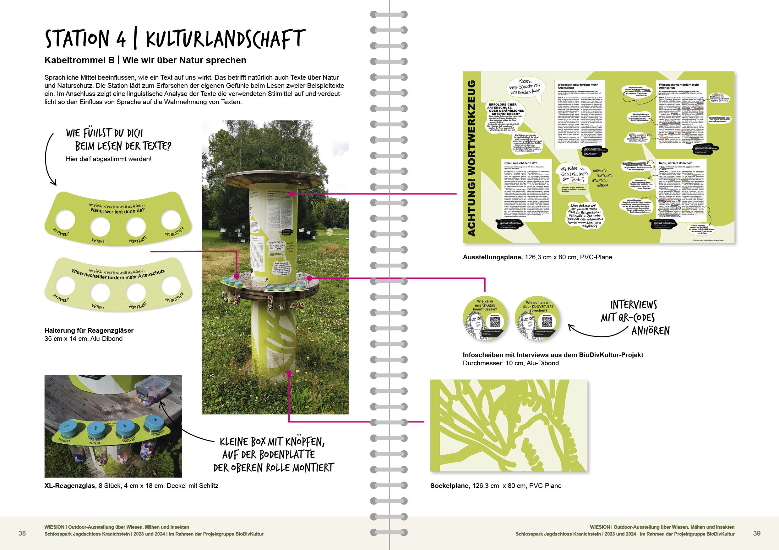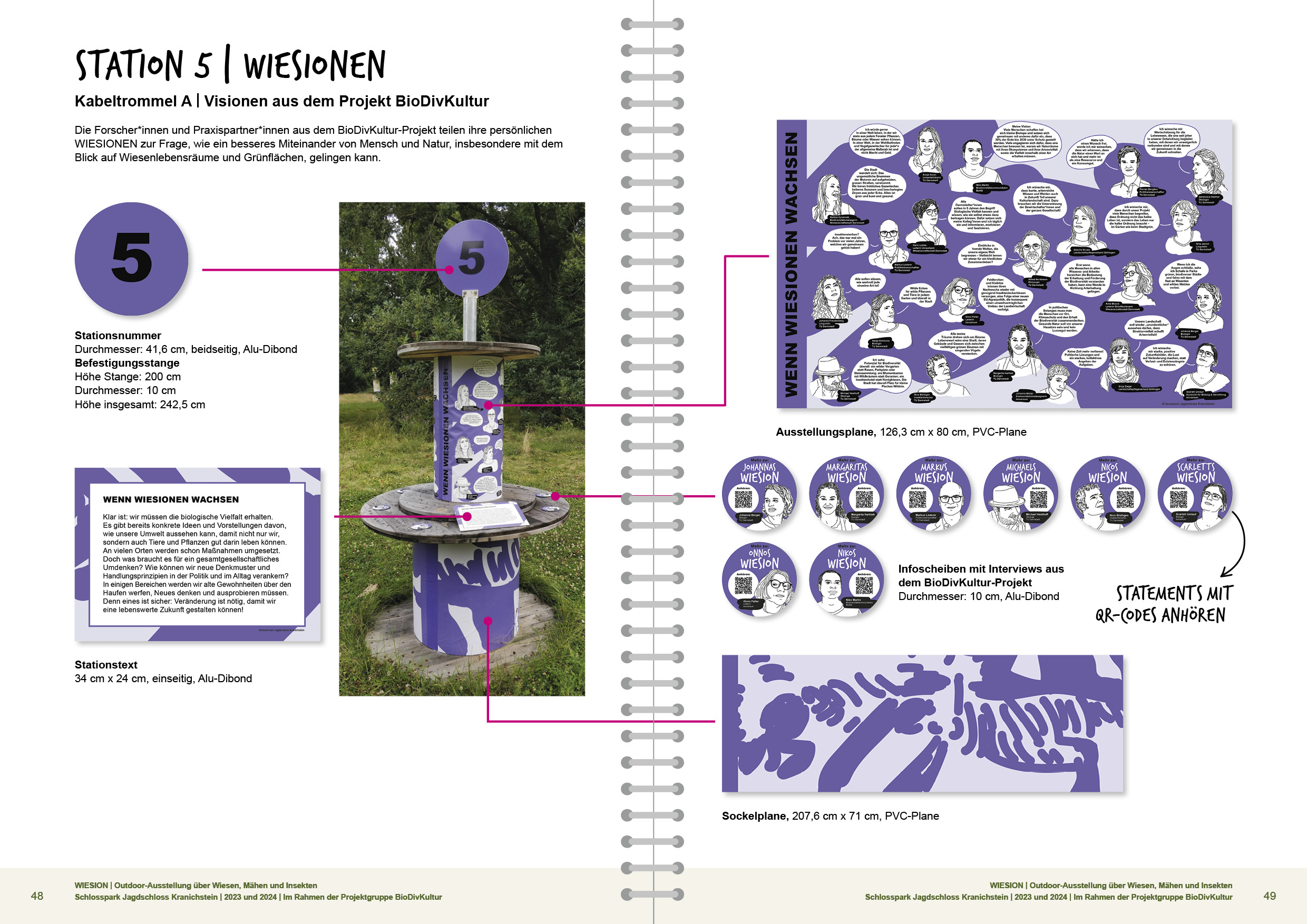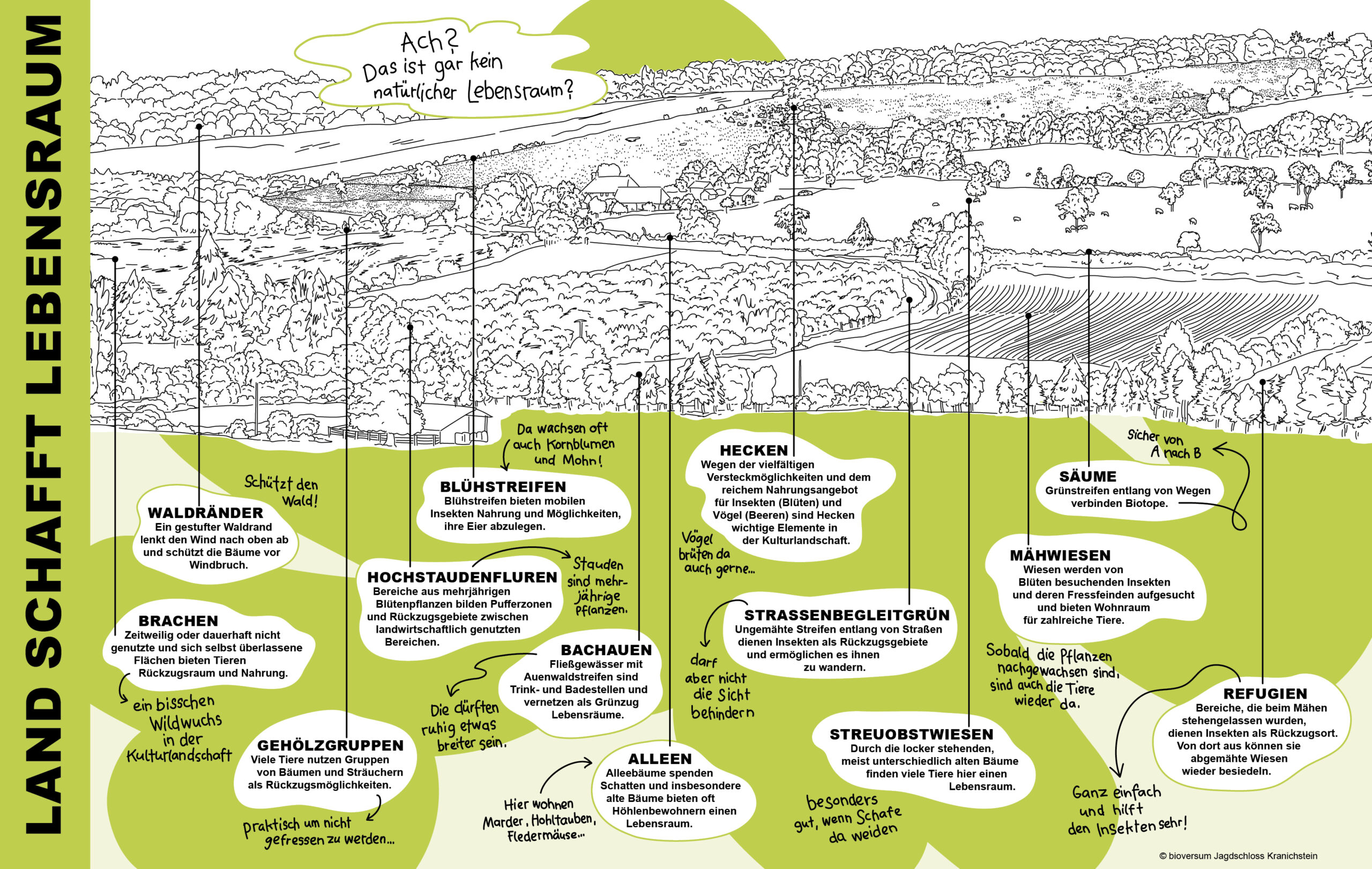 Neben dem bioversum Jagdschloss Kranichstein waren am Projekt BioDivKultur auch das Umwelt- und das Grünflächenamt der Wissenschaftsstadt Darmstadt, der BUND Darmstadt und der Landschaftspflegeverband Göttingen als Praxispartner beteiligt. Bei der Konzeption der Ausstellung wurde die Expertise der Projektpartner*innen aus den verschiedenen Bereichen zusammengebracht und durch Grafiken für ein allgemeines Publikum verständlich aufbereitet.