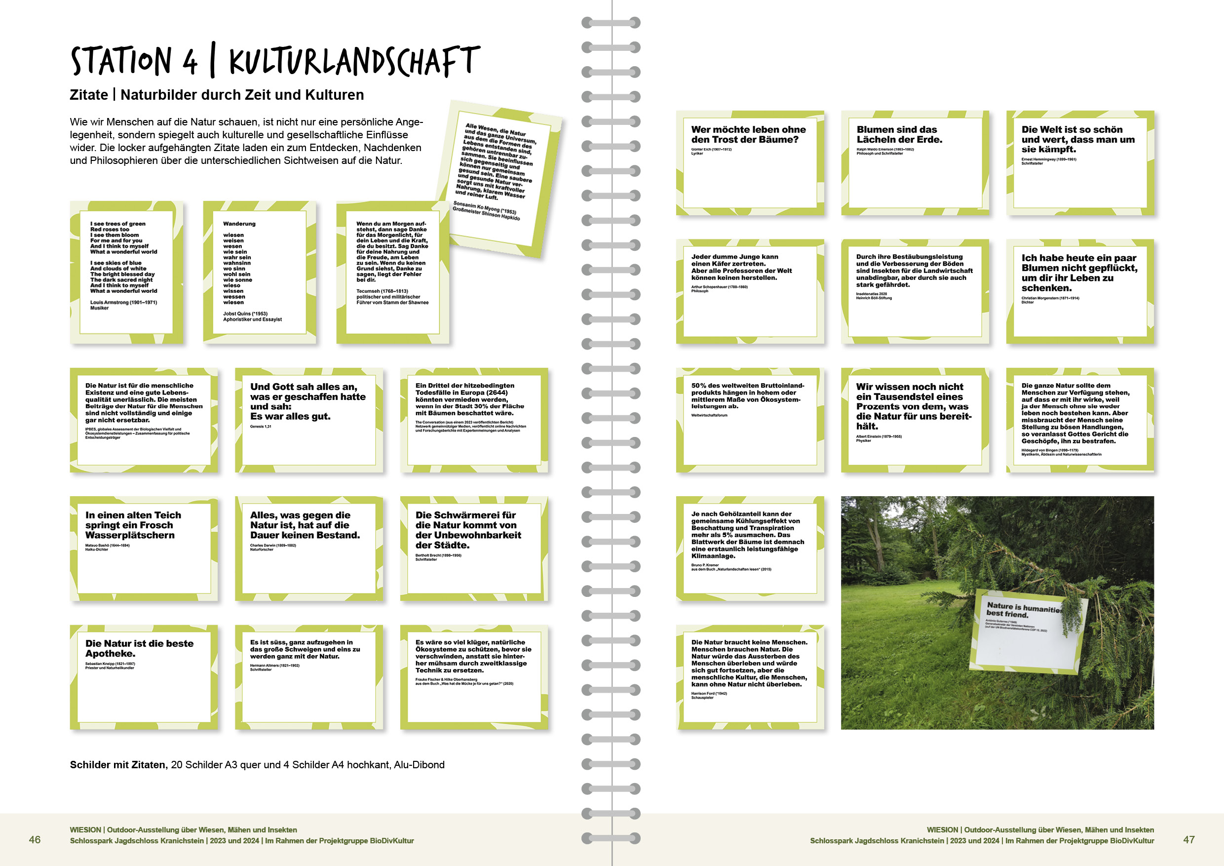 Nach zwei Jahren in unserem Schlosspark geht die WIESION als Wanderausstellung auf Reisen. Der modulare Aufbau ermöglicht eine Anpassung an verschiedene Gegebenheiten. Die Ausstellung kann auch komplett oder in Teilen auf eigene Kosten nachproduziert werden. Das bioversum stellt dazu kostenfrei die Druckdaten zur Verfügung. Die Materialien, die für die WIESION entstanden sind, können gerne von Kommunen, Umweltbildungseinrichtungen und Schulen kostenfrei genutzt werden.