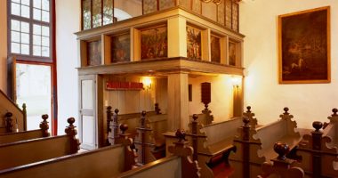 - Bis zu 80 Personen finden im hölzernen Chorgestühl und auf der Empore Platz